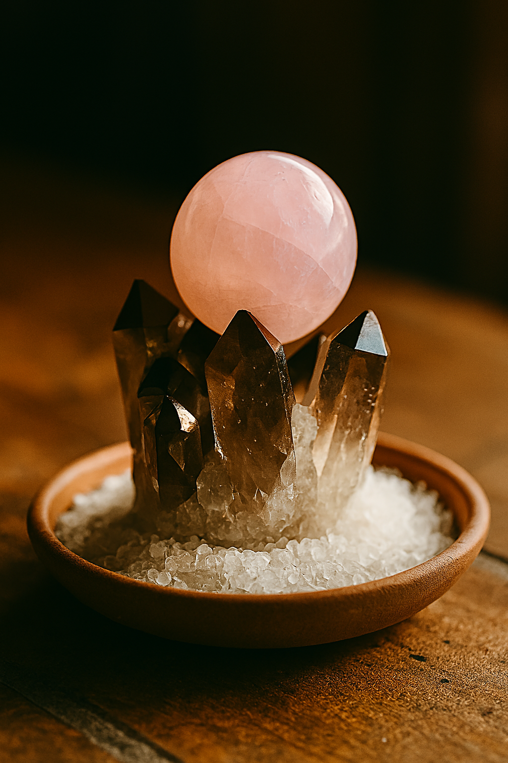 Renforcement de la purification en utilisant de l’eau salée (eau de mer ou eau + sel non raffiné) — mais uniquement avec des pierres résistantes, et pendant une durée courte (quelques minutes).